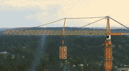 “塔吊”即“塔式起重机”。在开始施工时就要安装了,这时是以一般的移动式起重机吊装,一段一段组合而成。在塔柱里面,装有一个油压千斤顶,做为日后往上爬升之用。当建筑物一层一层往上盖,高度已经要触及塔吊时,就要进行爬升工作了。这时塔吊工程师会将固定塔吊的螺丝松开,操作千斤顶,将塔吊升高约一公尺,再将塔柱固定于建筑物的结构体上,然后缩起千斤顶并将底部固定于建物结构体上,再松开上部螺丝,撑起千斤顶,再上升一公尺,就这样,反覆操作,一伸一缩,至所需高度,再将塔柱确实固定。