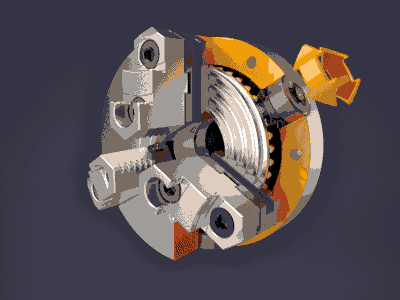 三爪卡盘是由一个大锥齿轮,三个小锥齿轮,三个卡爪组成。三个小锥齿轮和大锥齿轮啮合,大锥齿轮的背面有平面螺纹结构,三个卡爪等分安装在平面螺纹上。当用扳手扳动小锥齿轮时,大锥齿轮便转动,它背面的平面螺纹就使三个卡爪同时向中心靠近或退出。