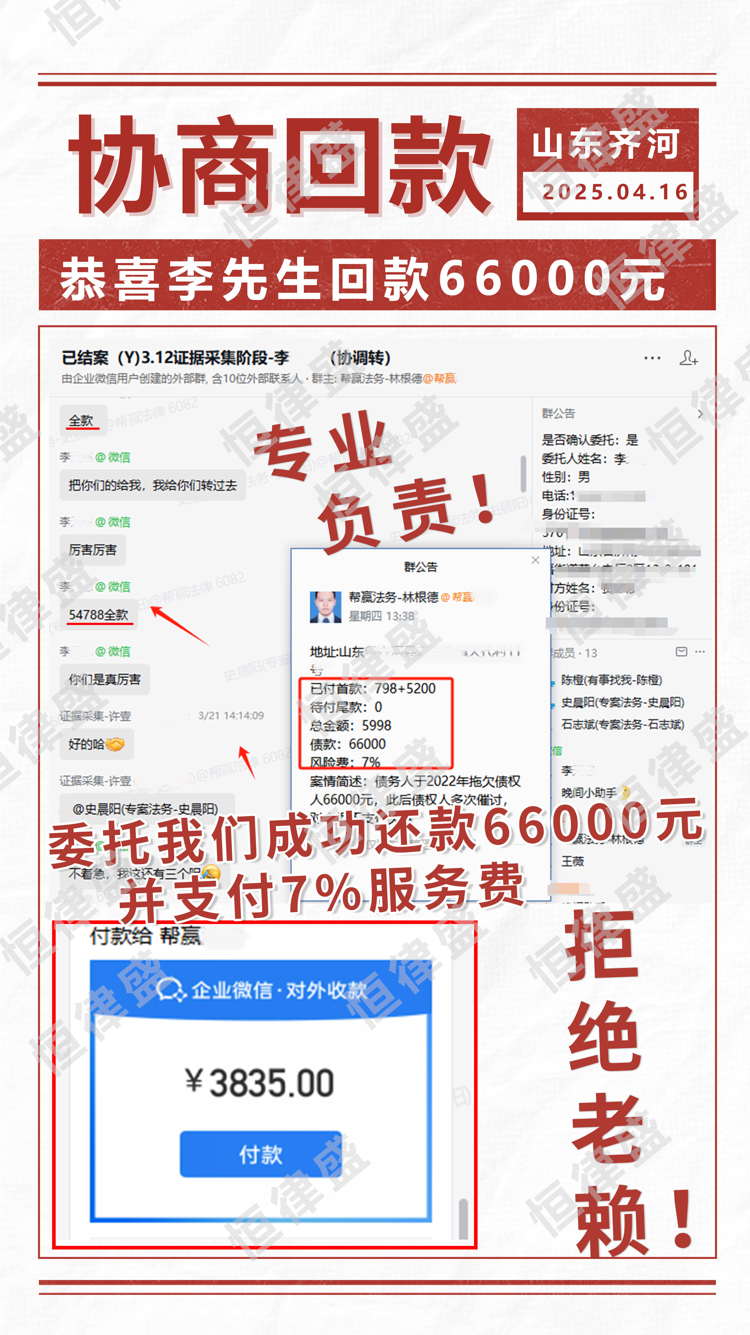 在恒律盛的全程协助下,李先生成功追回全部欠款66000元及维权费用,权益得到充分保障。