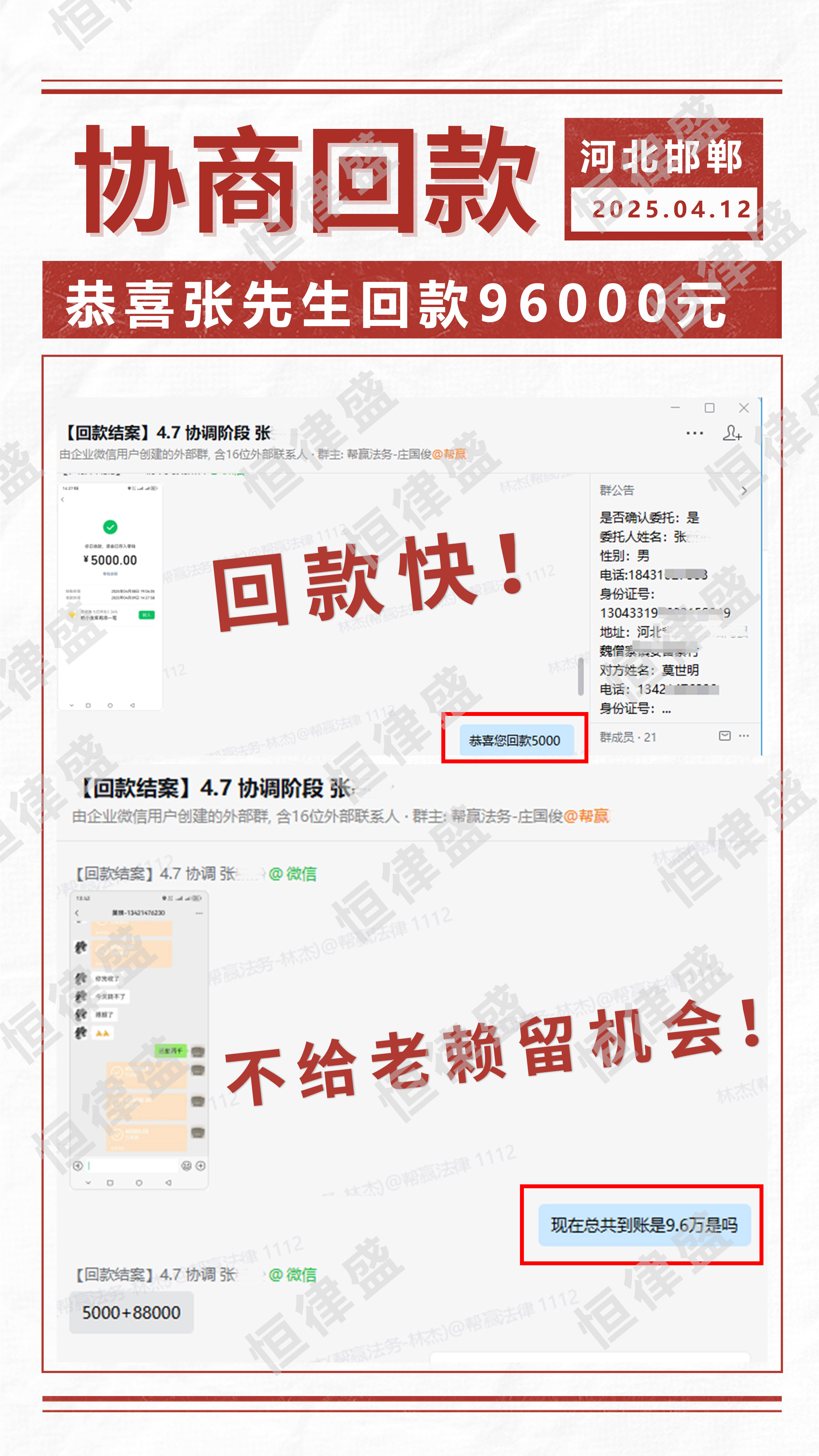 在恒律盛的快速介入与专业处理下,张先生于4月11日全额追回被拖欠的9.6万元工程款,纠纷得到高效化解。