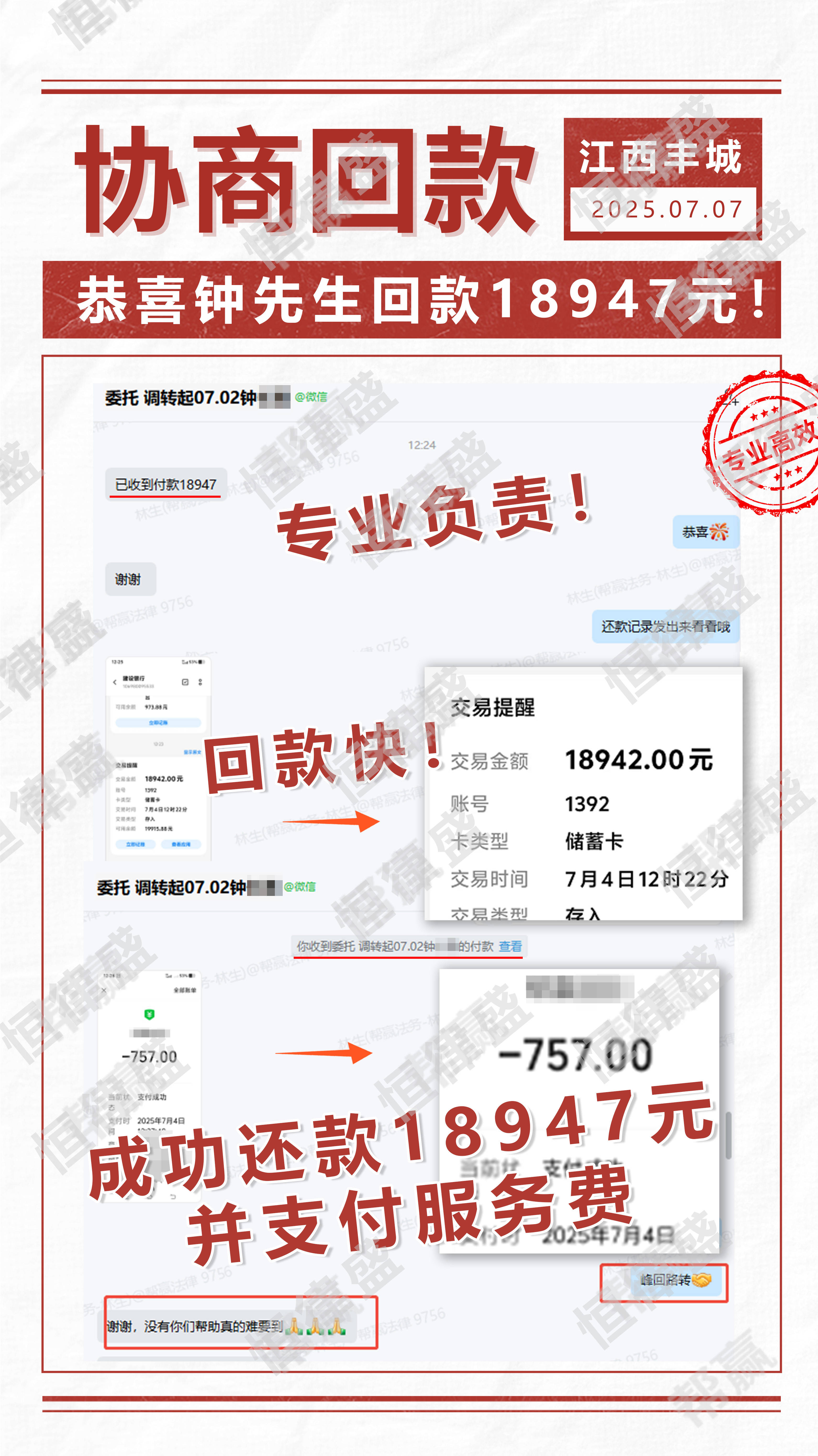 在恒律盛的持续跟进与专业介入下,陆某最终全额偿还了拖欠钟先生的18947元,租赁纠纷得以彻底解决。