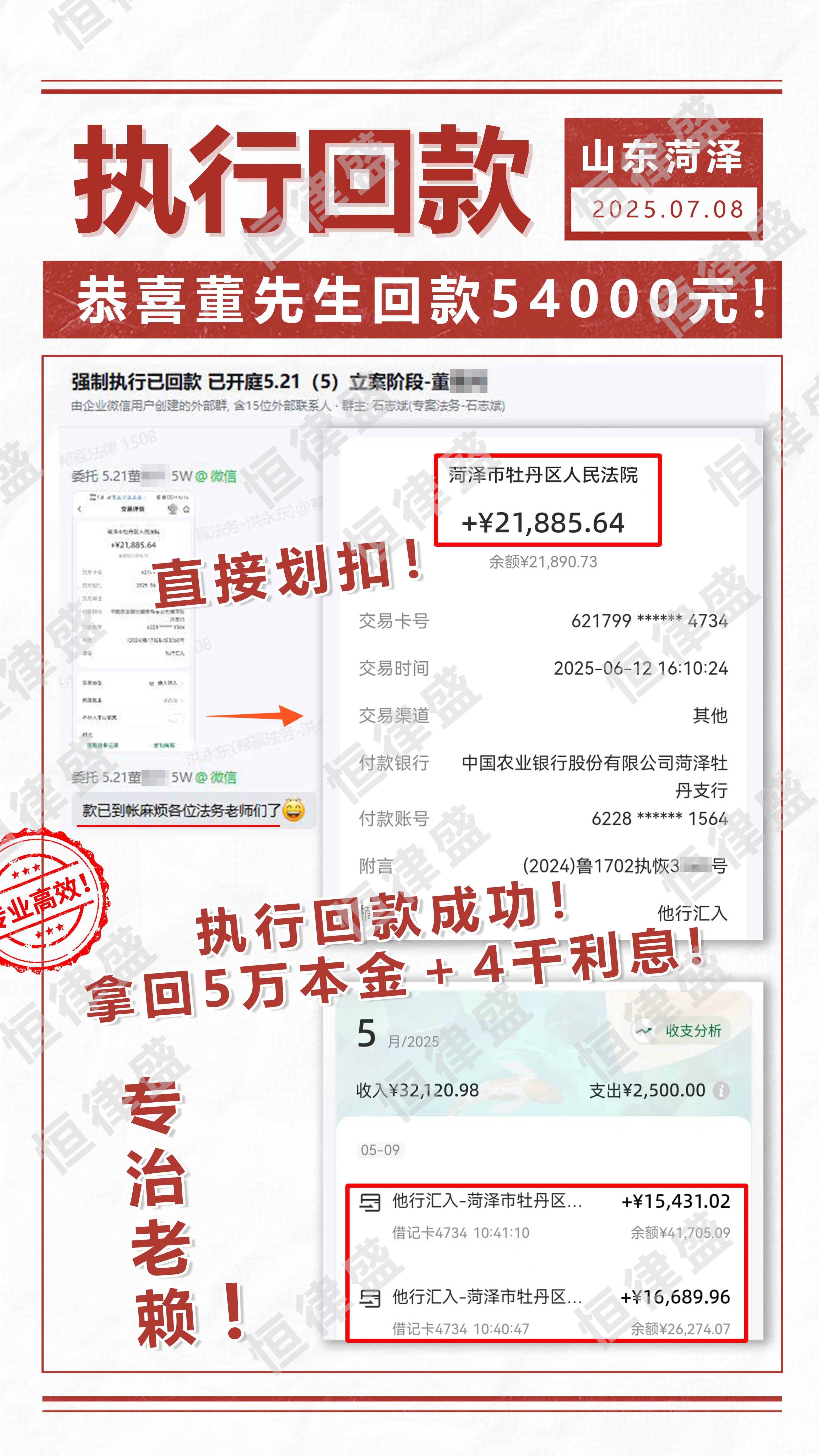 在恒律盛的专业协助下,董先生于6月12日收到法院转来的全部拖欠工资及利息共计5.4万元,权益得到全面保障。