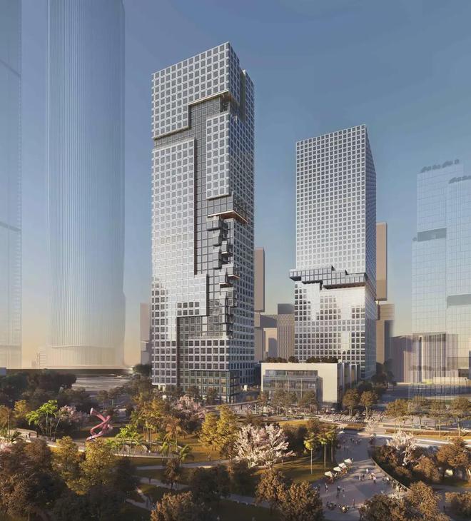 SLD、CCD、HHD三大设计机构联袂执笔,建筑形态引入中国传统高山流水意境,外立面创新采用数码像素化表达,焕新城市天际。
